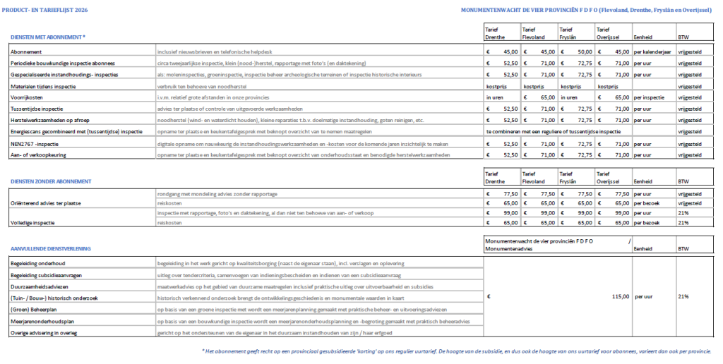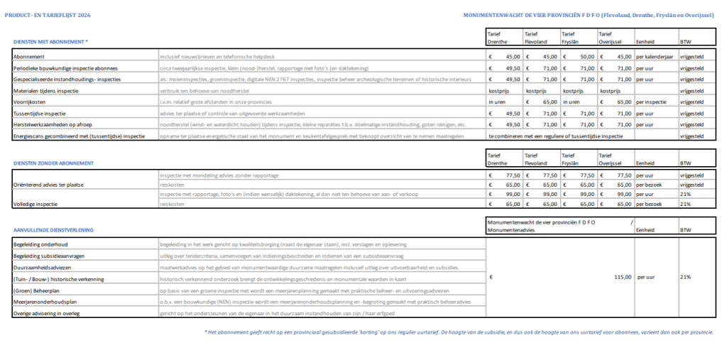 In navolging van de loonstijgingen afgelopen jaar (Monumentenwacht volgt de Cao provincies), zien wij ons ook voor 2026 genoodzaakt de tarieven aan te passen.